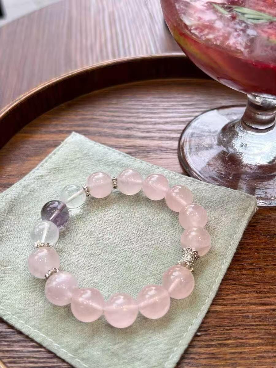 Materiais: Contas de quartzo transparente premium de 10 mm, ametista e quartzo rosa.